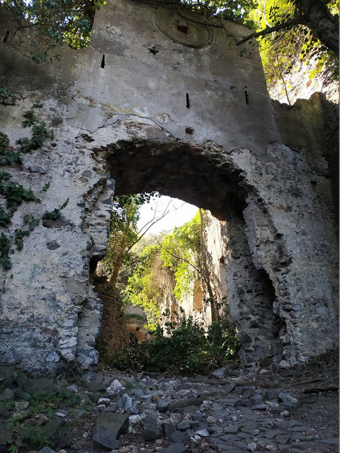 L’entrata del sentiero che porta alla città si trova sulla via di Santa Maria di Galeria, nei pressi di Osteria Nuova e molto vicina al lago di Bracciano. Dopo aver lasciato la macchina e attraversato un cancello (volutamente aggirabile), ci siamo incamminati su un viottolo sterrato circondato da meravigliosi campi fioriti (aiutati anche dalla bellezza della giornata). Dopo poche centinaia di metri ci si ritrova a costeggiare uno sperone di tufo che si alza sulla sinistra della via: in cima ad esso si trovano i resti della città. A causa del forte vento di quei giorni, caddero molti alberi. Uno di questi ce lo siamo trovato davanti, a sbarrare la strada in salita che conduce alla porta del borgo. Superato l’albero senza troppi problemi, siamo arrivati alla porta. Il fascino della città comincia subito a farsi sentire: la fitta vegetazione cresciuta senza ostacoli riempie ogni angolo, coprendo dai raggi del sole quasi tutti i resti dell’antico insediamento. Superata l’entrata, ci si immerge in un’atmosfera cinematografica (in effetti Galeria Antica è stata spesso usata come location per film e serie tv) nella quale non si distingue facilmente l’opera umana da quella della natura. I numerosi resti degli edifici, infatti, si compenetrano con gli alberi e la massiccia vegetazione presente. Del castello e delle diverse chiese che c’erano un tempo, non rimangono che poche testimonianze ridotte in macerie. Uno dei pochi elementi rimasti in piedi è il campanile della chiesa di San Nicola. Esso sorge sul bordo ovest, affacciandosi sulla parte di sperone costeggiato dal fiume Arrone.