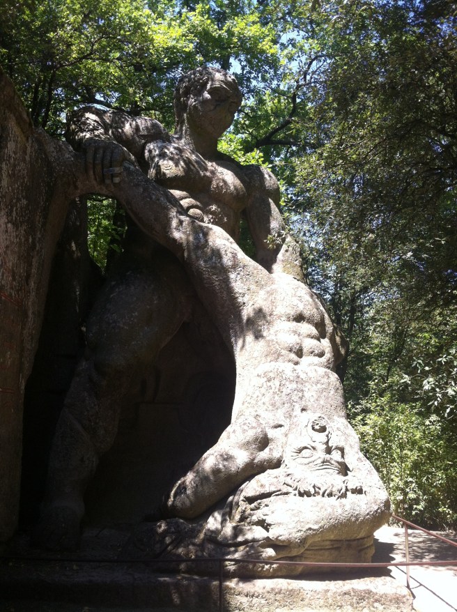 Una volta entrati nel parco attraverso un portale in pietra dominato da una sfinge(una sorta di guardiano dell’ingresso), veniamo subito circondati da una vegetazione rigogliosa. I molti alberi e dislivelli del terreno non permettono di avere una visione completa del parco che, statua per statua, si rivela al visitatore. Camminando sul sentiero del percorso moderno ci imbattiamo nella grande bocca spalancata di Proteo(o Glauco) e poco dopo all’enorme complesso di Ercole e Caco, conosciuta anche come “Lotta tra giganti”. Quest’ultima in particolare è la statua più grande del parco e personalmente mi ha lasciato di stucco tanto per le proporzioni quanto per i soggetti, ripresi dalla mitologia classica: Ercole, adirato per il furto dei buoi commesso dal mostro e gigante Caco, lo scova e i due ingaggiano una furiosa lotta che si conclude con Ercole che stritola Caco, facendogli uscire gli occhi dalle orbite. Sicuramente un racconto mitologico d’effetto, che tratta il tema della sfida, dell’ira, della hybris (la tracotanza che porta l’uomo a presumere della propria potenza e fortuna e a ribellarsi contro l’ordine costituito) e delle sue conseguenze. Un mito dietro al quale di certo si può leggere una lezione oppure un passaggio di un tortuoso percorso di iniziazione.