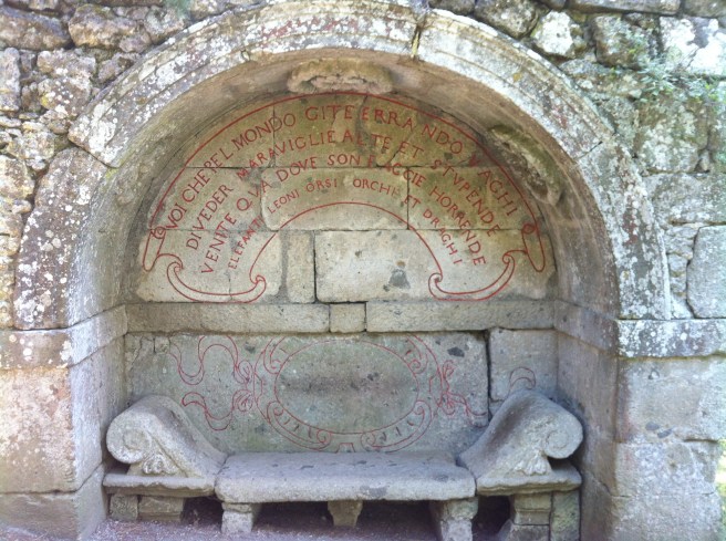 Seguendo il percorso suggerito(non facilissimo da seguire a dirla tutta!) ci si imbatte nella Panca Etrusca, dove troviamo incise parole emblematiche su chi visita il parco: