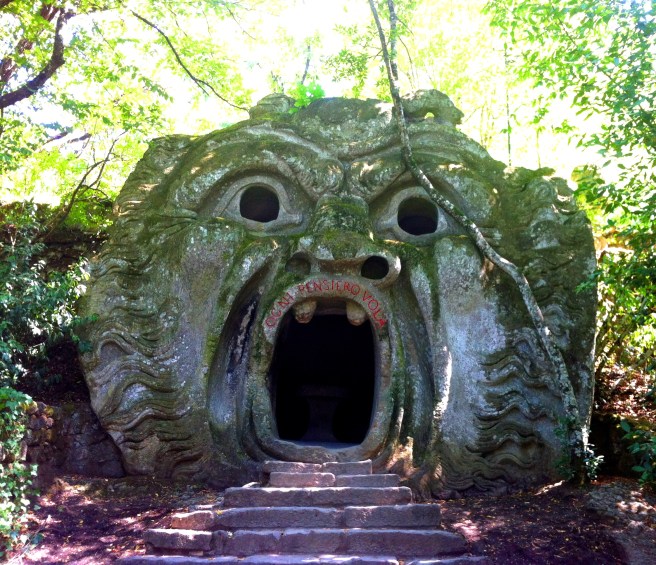 Si arriva quindi alla statua più famosa del parco: L’Orco. Questo volto gigante, la cui bocca aperta (in un grido che terrorizza) è la porta di accesso ad una stretta stanza, porta incisa una scritta sul labbro superiore: “Ogni pensiero vola”. Se si entra nella bocca dell’orco, le voci risuoneranno distorte e modificate a chi le ascolta dall’esterno. Gli occhi sbarrati e le fattezze mostruose del mascherone, che ricordano i disegni di Michelangelo sulle figure grottesche, con il passare del tempo sono diventate il vero e proprio simbolo del Parco dei Mostri di Bomarzo. Sappiamo tuttavia che la frase sulla bocca del mascherone non corrisponde all’originale: Da un disegno di Giovanni Guerra, contemporaneo di Orsini, si può leggere la frase originale “Lasciate ogni pensiero o voi ch’intrate”, un chiaro (anche se rivisitato) riferimento letterario a Dante Alighieri e, forse, un invito alla spensieratezza.
