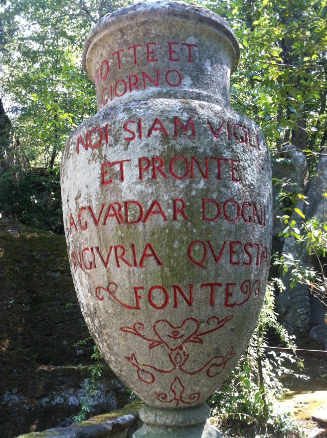 Per molti secoli scienziati, filologi, storici e curiosi si sono interrogati sul significato intrinseco di questa grande opera simbolica. Ci sarà una chiave di lettura logica oppure (forse ancora più affascinante) il parco è davvero un luogo ameno dove convivono amore per l’arte visiva e letteratura e dove le opere grottesche vengono generate “Sol per sfogare il core”, come segnala l’iscrizione-chiave sul pilastro del luogo?