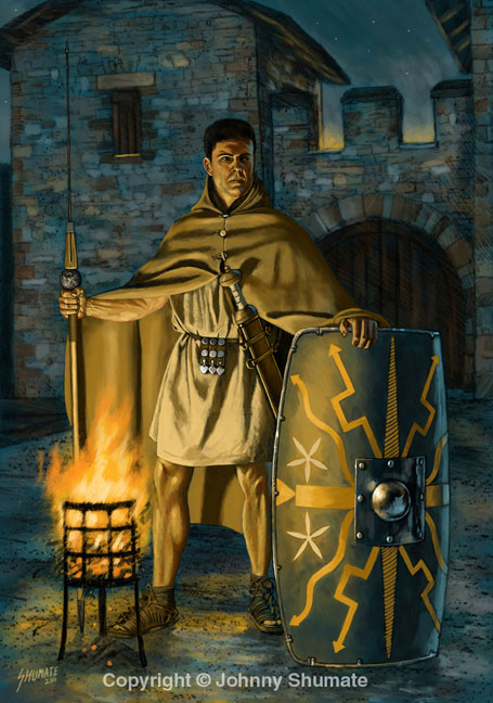– Armatura laminare classica(Lorica segmentata) oppure indossavano una semplice tunica bianca, a volte annessa al sagum(il tipico mantello romano).