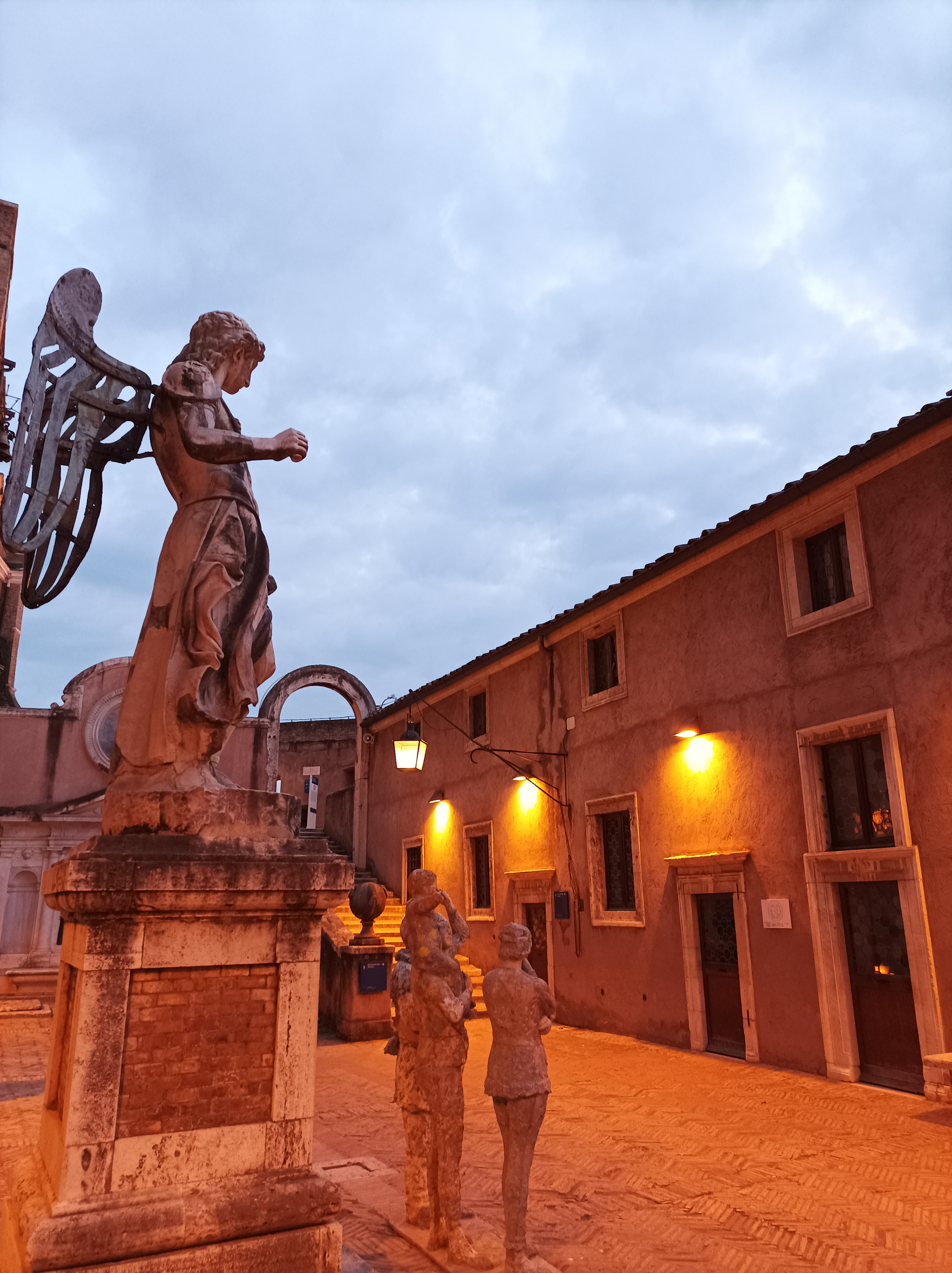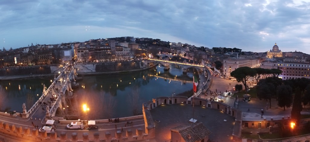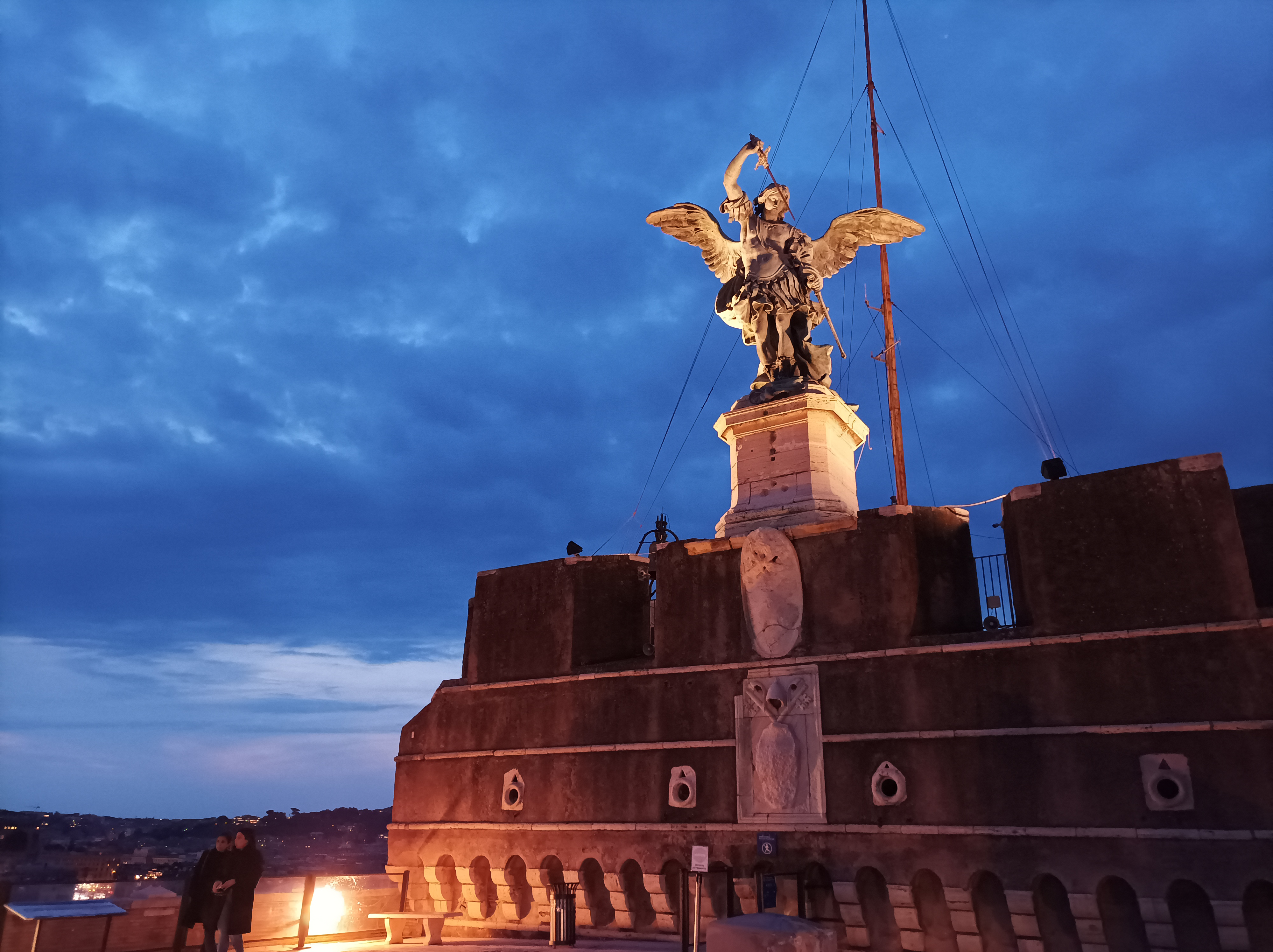 Infine si sale fino al punto più alto: il terrazzo dell’Angelo, da cui si ha una vista mozzafiato a 360 gradi su tutta Roma e dove ci si trova in compagnia della grande statua in bronzo dell’arcangelo Michele che, rinfoderando la sua spada, domina l’intera città.