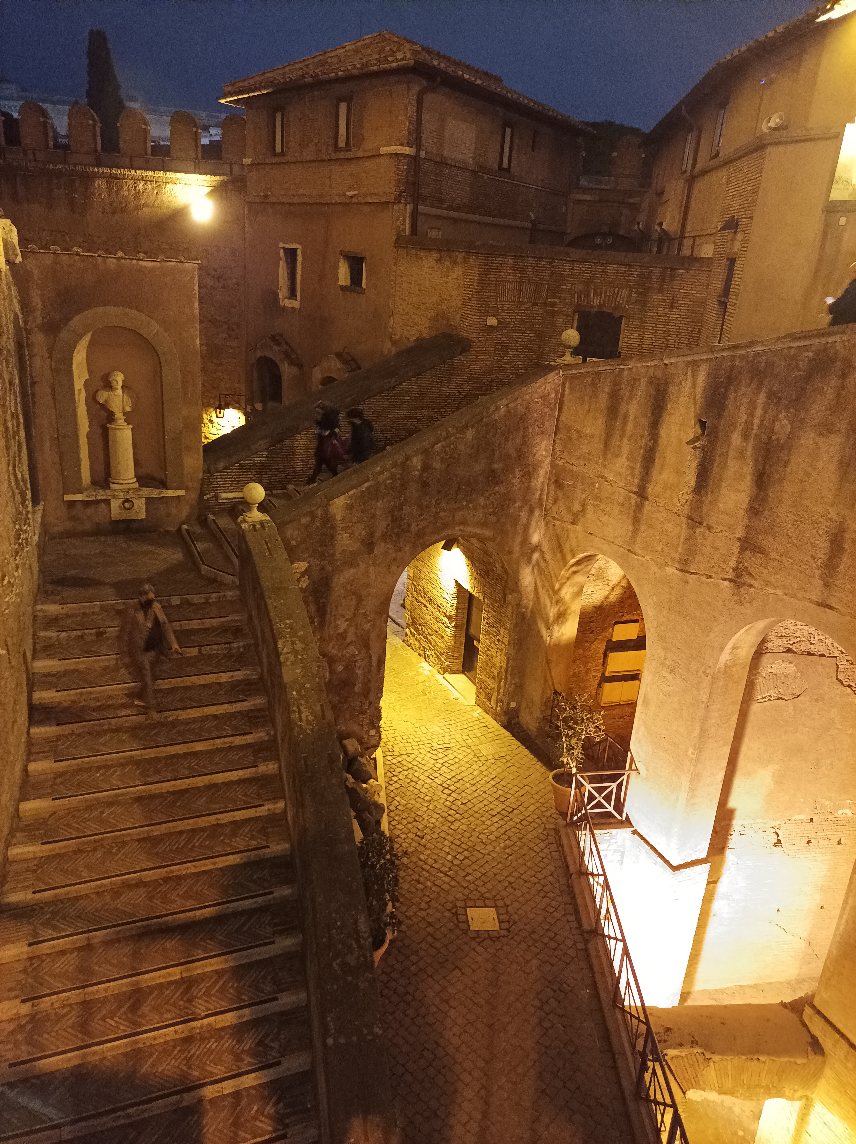 La rampa è illuminata e “servita da quattro grandi aperture verso l’alto e porta fino alla Sala delle Urne, il cuore del mausoleo e il luogo dove riposavano le spoglie dell’imperatore: questa zona è stata modificata nel medioevo rendendo la Sala delle Urne un ennesimo elemento di difesa (con una sorta di ponte levatoio sopraelevato ed entrata fortificata) per impedire ad eventuali nemici di proseguire verso i piani rialzati. Salendo verso l’alto si giunge all’aperto -e al castello vero e proprio- nell’elegante e funzionale cortile dell’Angelo, con la suggestiva statua realizzata Raffaello da Montelupo: questa zona affaccia sugli appartamenti pontifici e -parallelamente- conduce al camminamento di ronda da cui si può osservare l’intero panorama circostante.
