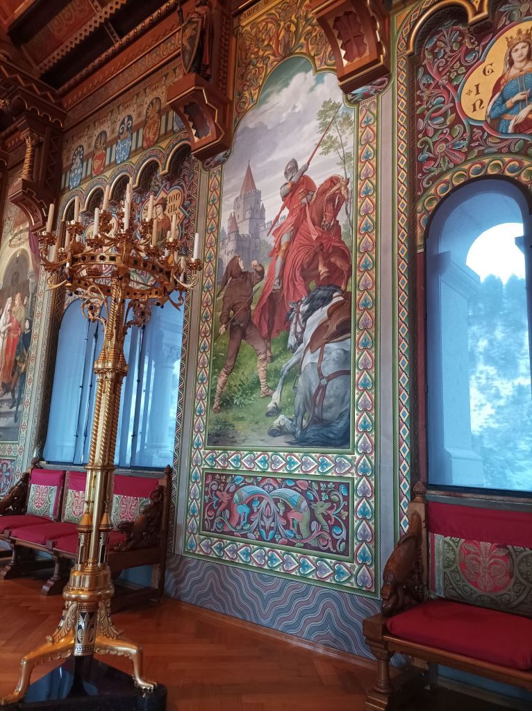 L’ultimo ambiente di cui voglio parlarvi è la Sala dei Cantori; questa è probabilmente la stanza più grande e più importante di tutto il castello di Neuschwanstein. Riccamente decorata in ogni dettaglio, La sala doveva essere utilizzata per le rappresentazioni teatrali o musicali, ma nessuna grande rappresentazione venne mai eseguita qui. Non ce ne fu il tempo, o forse l’intenzione…forse questa sala era semplicemente il definitivo omaggio del re all’epica cavalleresca e a personaggi mitologici come Lohengrin o Parsifal, il cui racconto è dipinto sulle pareti della Sala dei Cantori.
