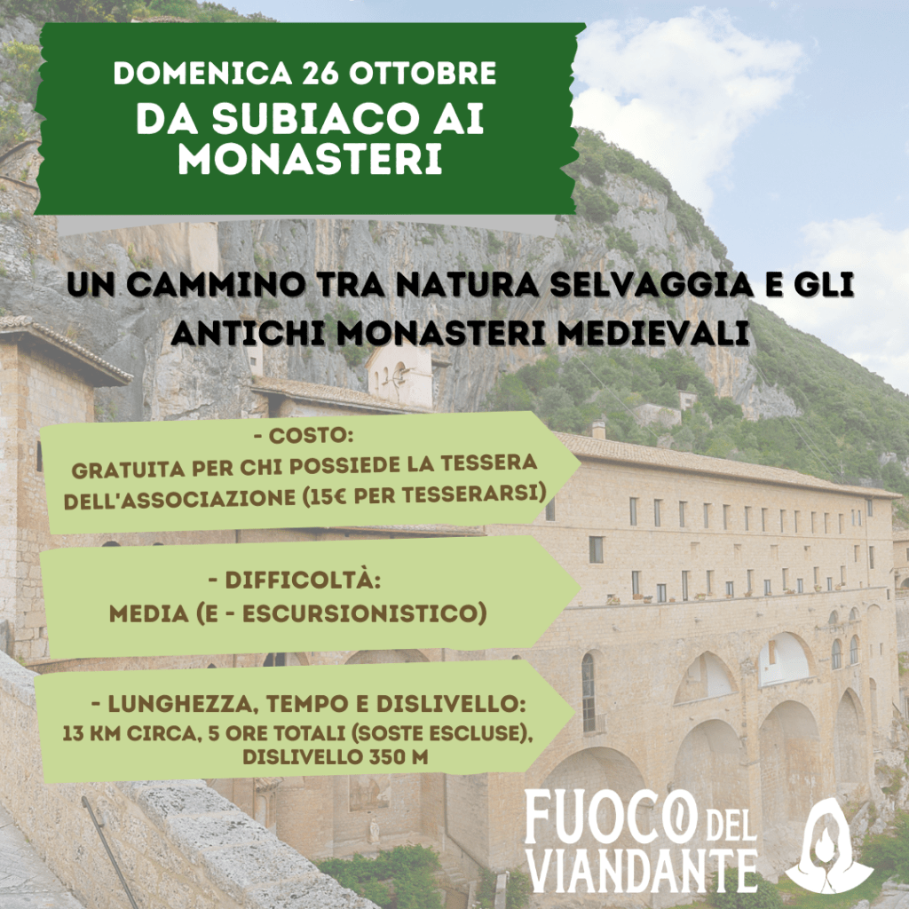 - Domenica 26 ottobre: Andiamo alla scoperta dei Monasteri Benedettini di Subiaco, immersi nella spettacolare cornice del Parco dei Monti Simbruini, questi Monasteri hanno ispirato scrittori e artisti, uno fra tutti il grande Umberto Eco per Il Nome della Rosa!